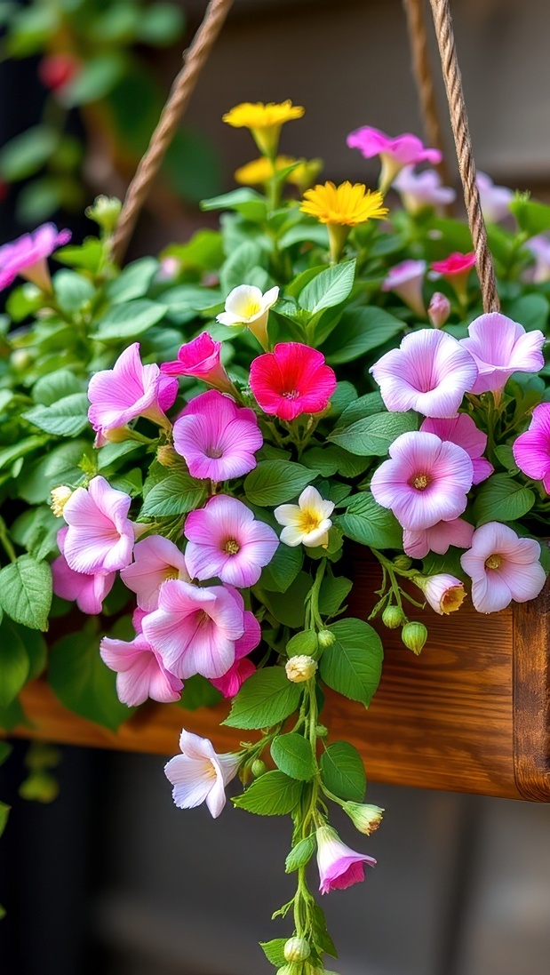 Edytor tapety: Kolorowe petunie w wiszącej skrzynce