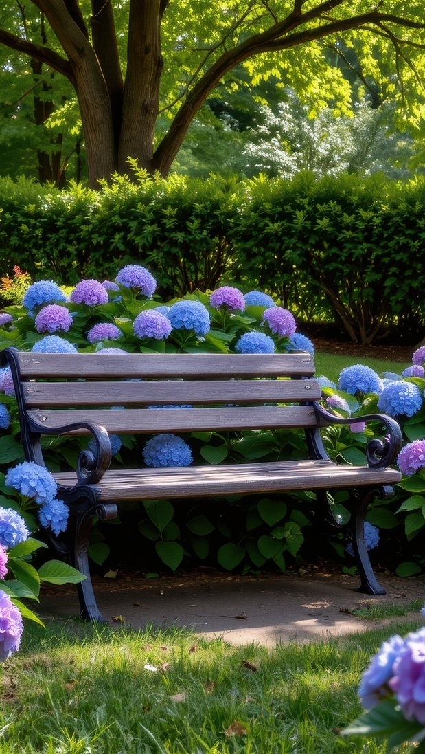 Edytor tapety: Ławka wśród hortensji w parku