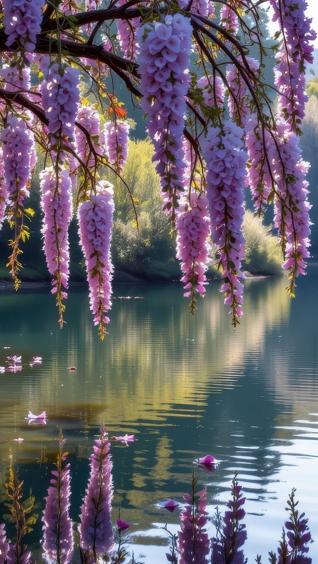 Edytor tapety: Kwiaty glicynii zwisające nad jeziorem