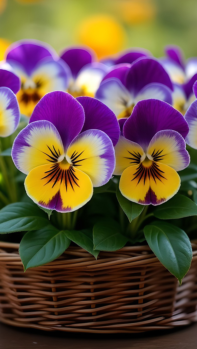 Edytor tapety: Żółto-fioletowe bratki w koszyku