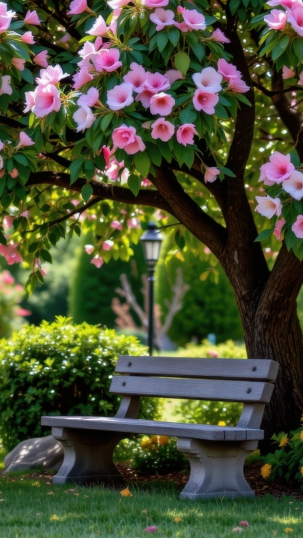 Edytor tapety: Ławka pod kwitnącym drzewem