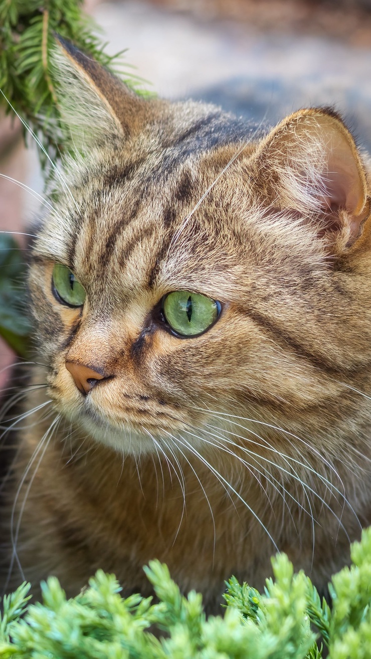 Edytor tapety: Bury zielonooki kot obok iglastych gałązek