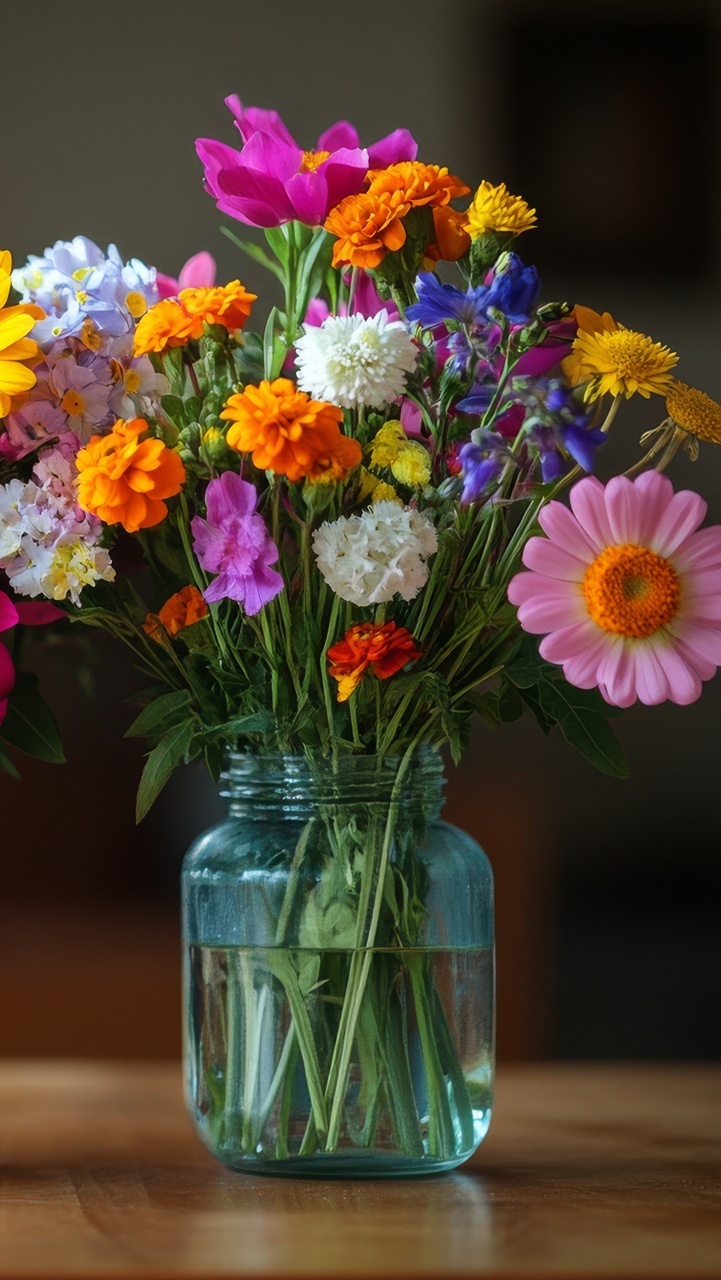 Edytor tapety: Bukiet kolorowych kwiatów w słoiku