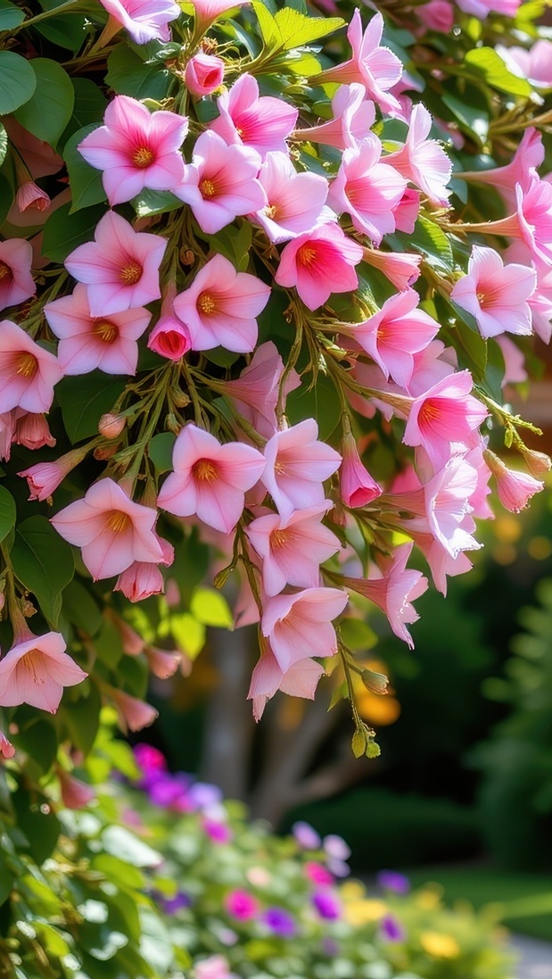 Edytor tapety: Zwisające różowe kwiaty w ogrodzie