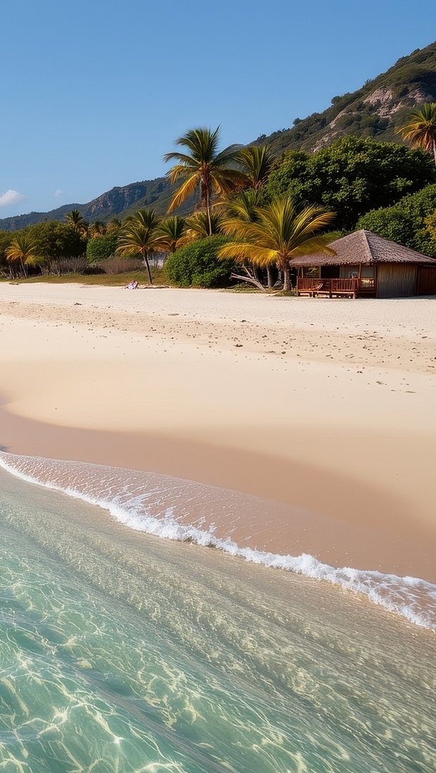 Edytor tapety: Domek pod palmami przy morskiej plaży