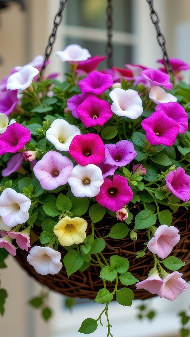 Edytor tapety: Kolorowe petunie wiszące w koszyku