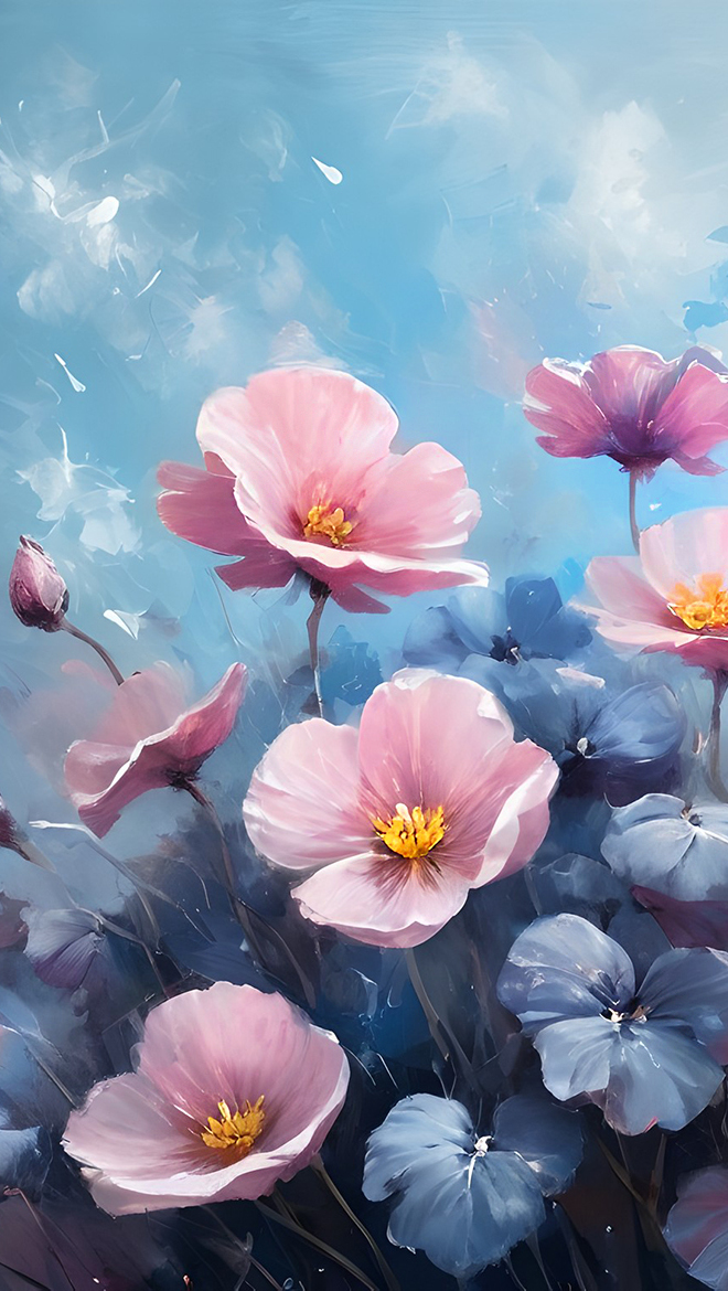 Edytor tapety: Różowe kwiaty na niebieskim tle