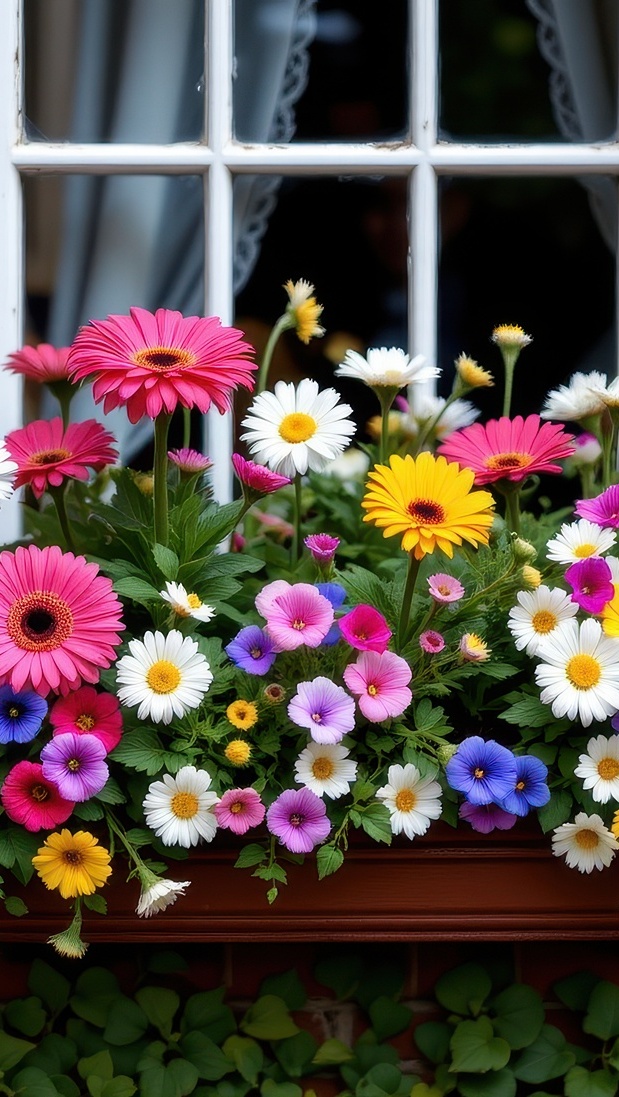 Edytor tapety: Kolorowe kwiaty w skrzynce przy oknie