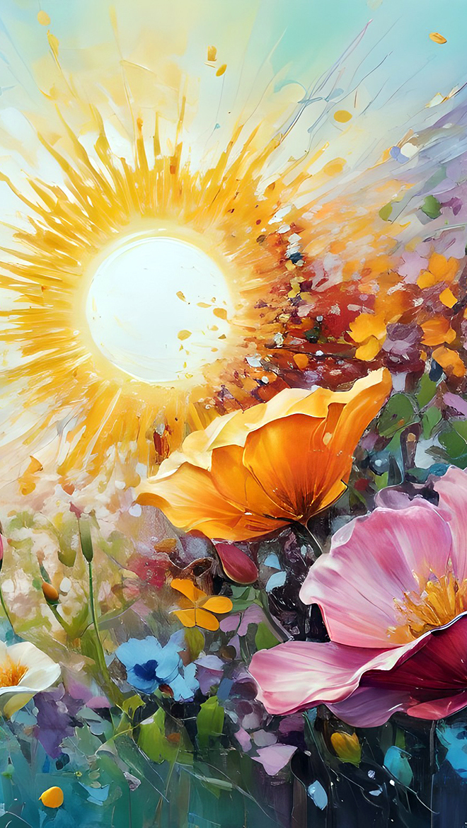 Edytor tapety: Kolorowe kwiaty i słońce w grafice