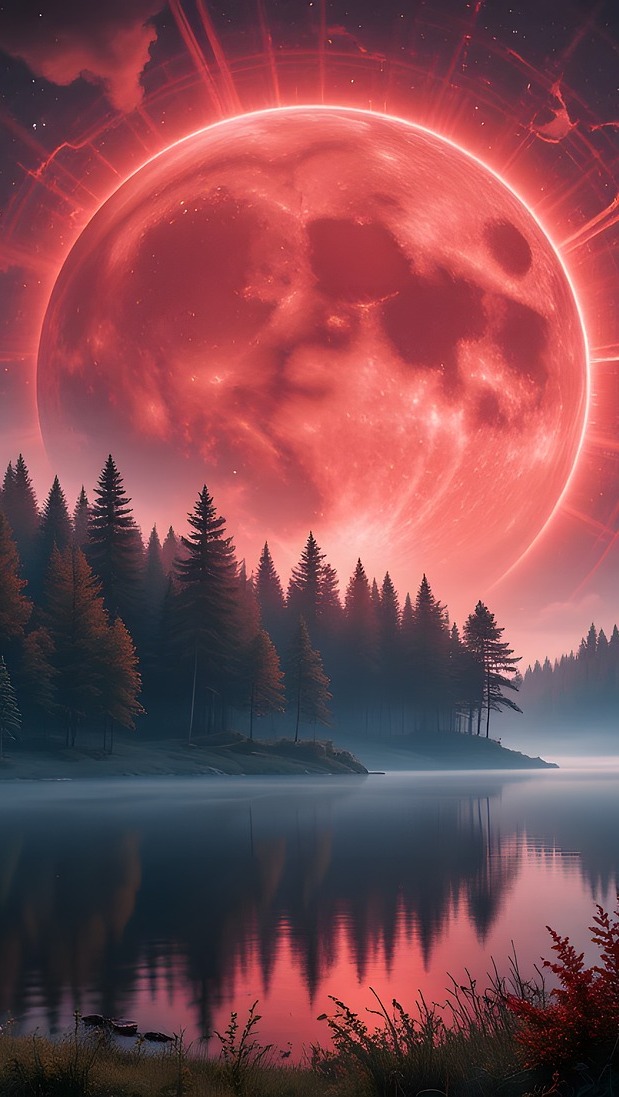Edytor tapety: Czerwony księżyc nad lasem i jeziorem