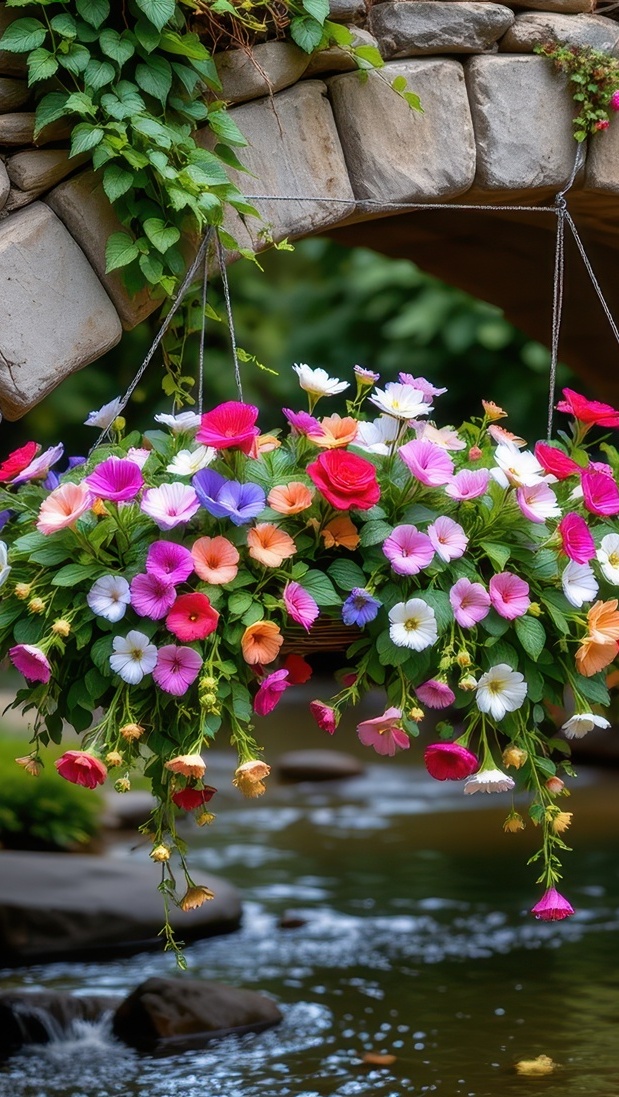 Edytor tapety: Wiszące kolorowe kwiaty na kamiennym moście