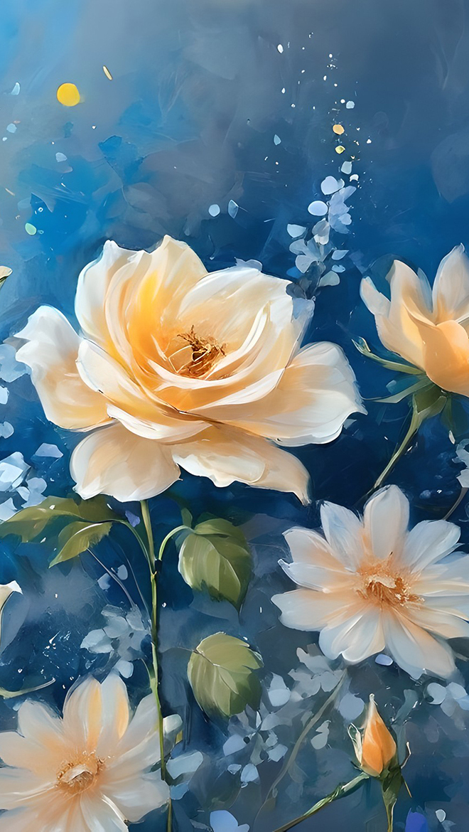 Edytor tapety: Rozkwitnięte kremowe róże na niebieskim tle