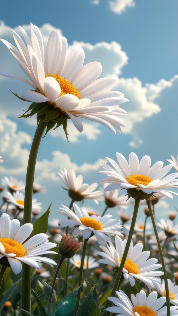 Edytor tapety: Rozświetlone słońcem rumianki na tle nieba