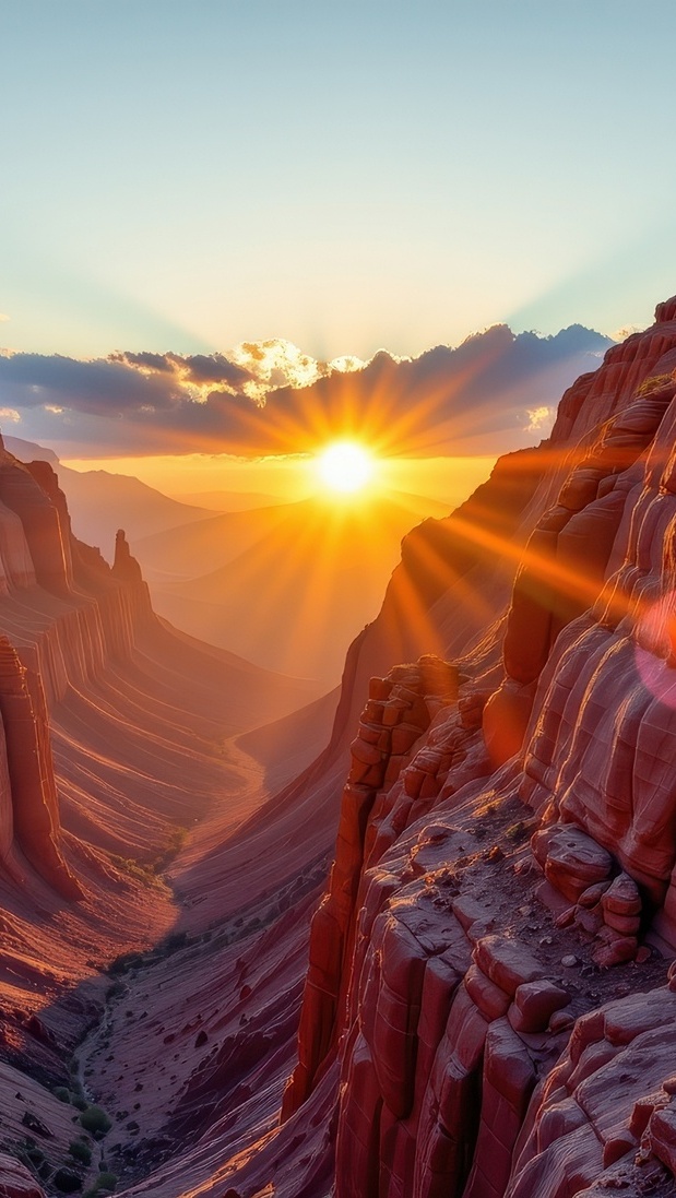 Edytor tapety: Promienie zachodzącego słońca padające na kanion