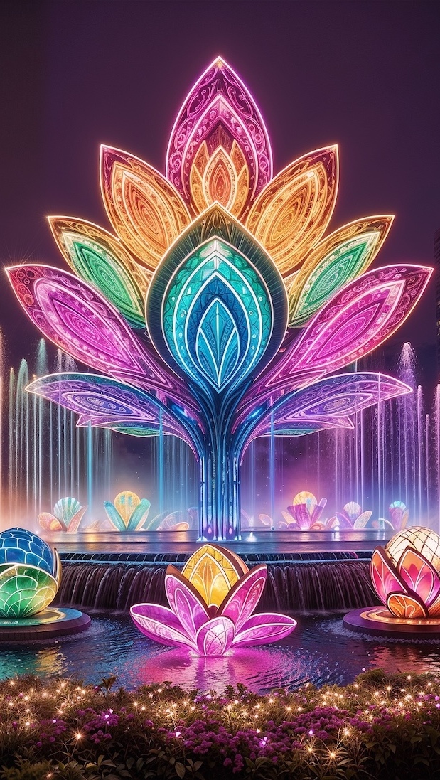 Edytor tapety: Fontanna rozświetlona kolorowymi światłami