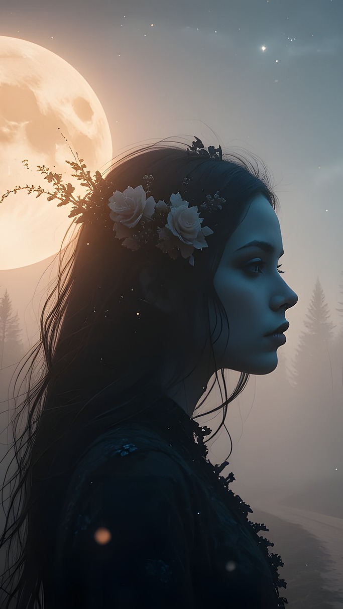 Edytor tapety: Zamyślona dziewczyna na tle księżyca
