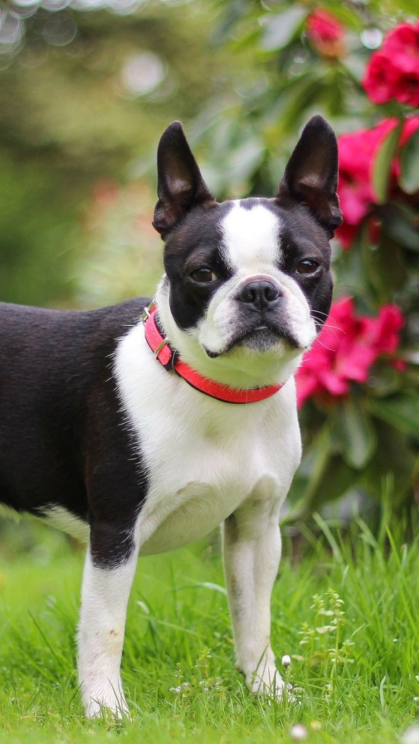 Edytor tapety: Boston terrier stojący obok krzewu rododendronu
