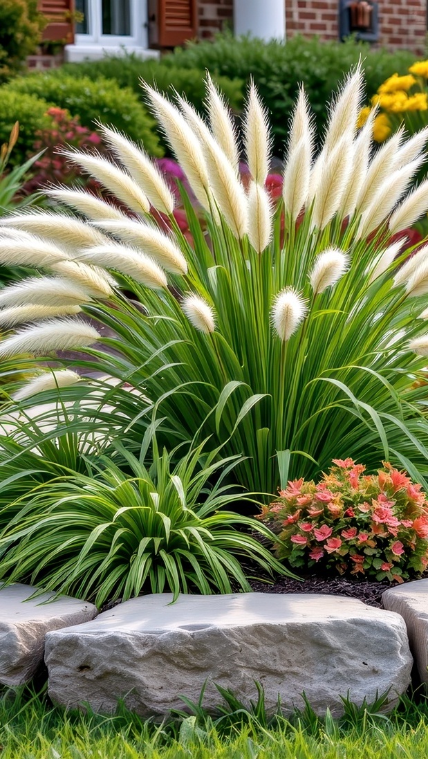 Edytor tapety: Klomb z trawami ozdobnymi w ogrodzie