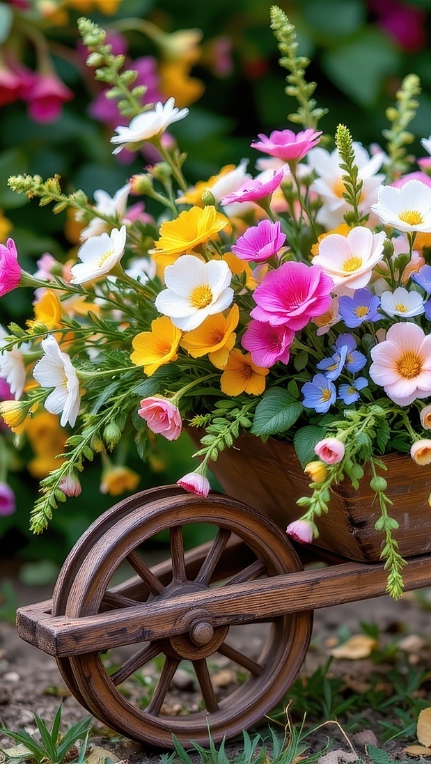Edytor tapety: Kolorowe kwiaty w drewnianej taczce
