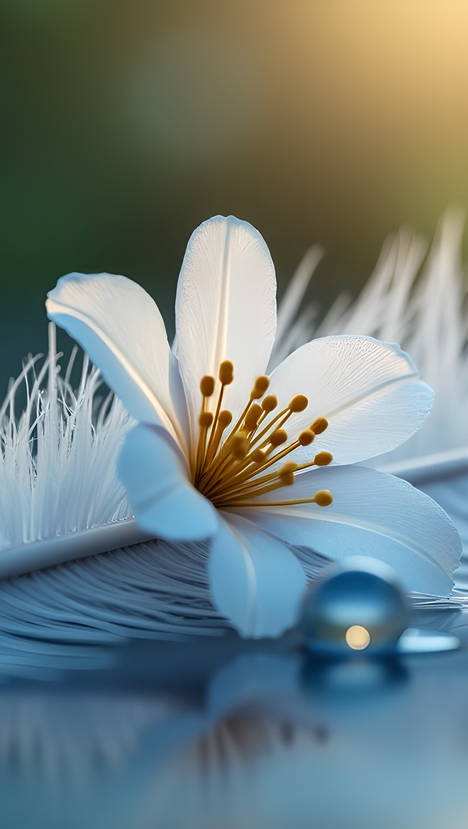 Edytor tapety: Piórko i biały kwiat obok kropli