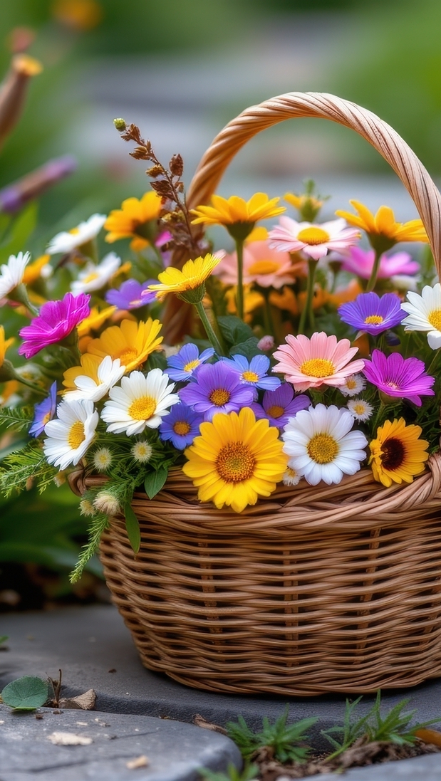 Edytor tapety: Wiklinowy koszyk z kolorowymi kwiatami