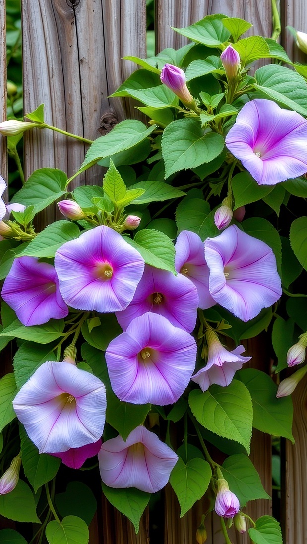 Edytor tapety: Fioletowy pnący powój na drewnianym płocie
