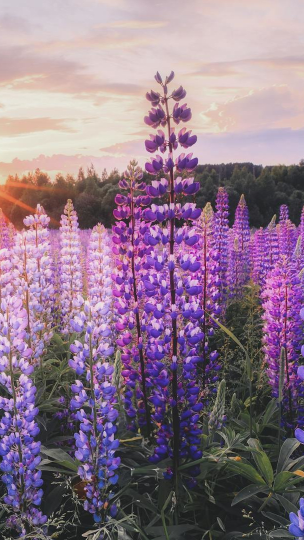 Edytor tapety: Rozświetlony słońcem fioletowy łubin na łące