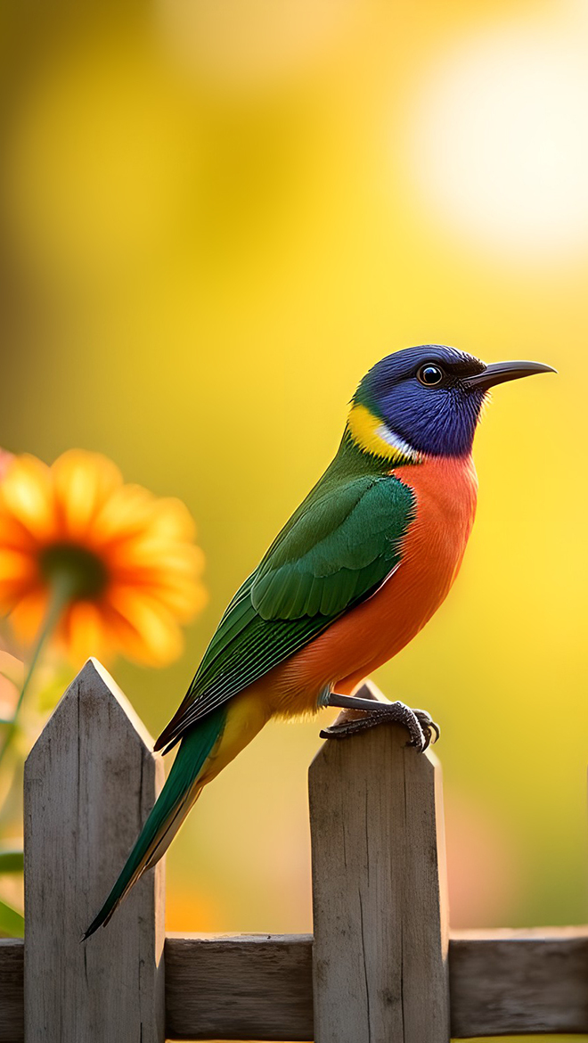 Edytor tapety: Kolorowy ptak na drewnianym płocie