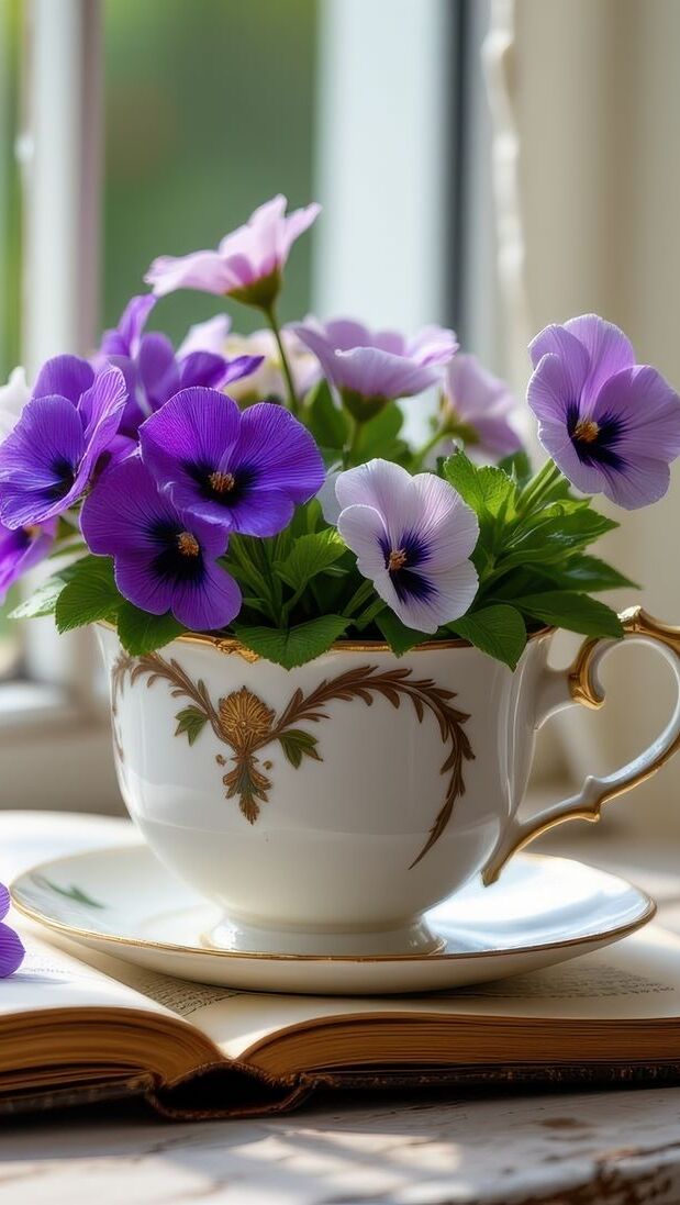 Edytor tapety: Filiżanka z bratkami na otwartej książce