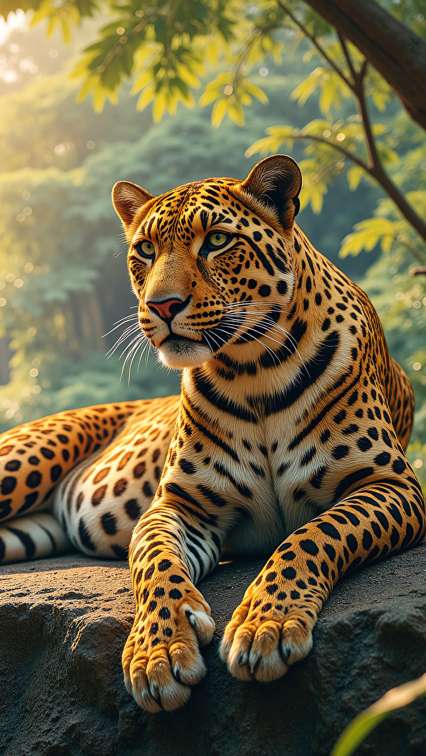 Edytor tapety: Lampart leżący na kamieniu pod drzewem