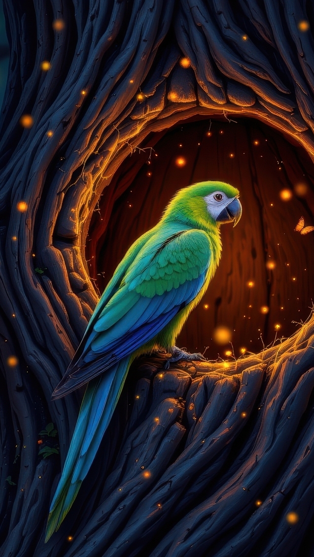 Edytor tapety: Papuga w oświetlonej dziupli