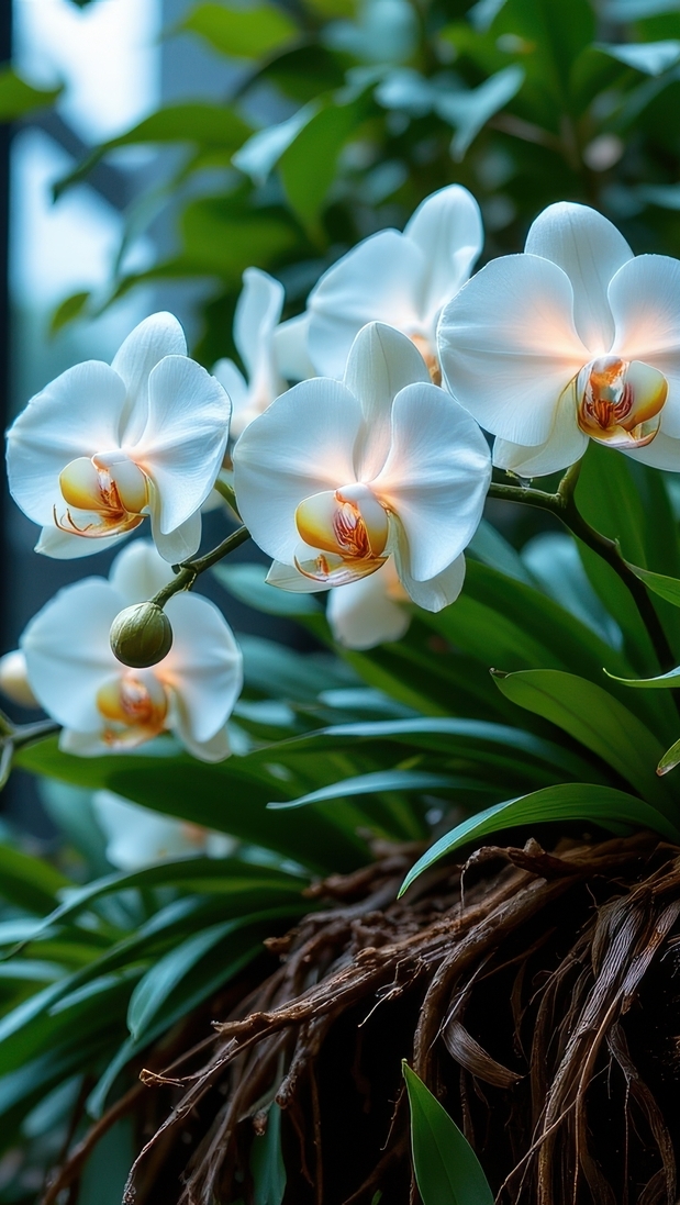 Edytor tapety: Rozświetlone białe storczyki i liście