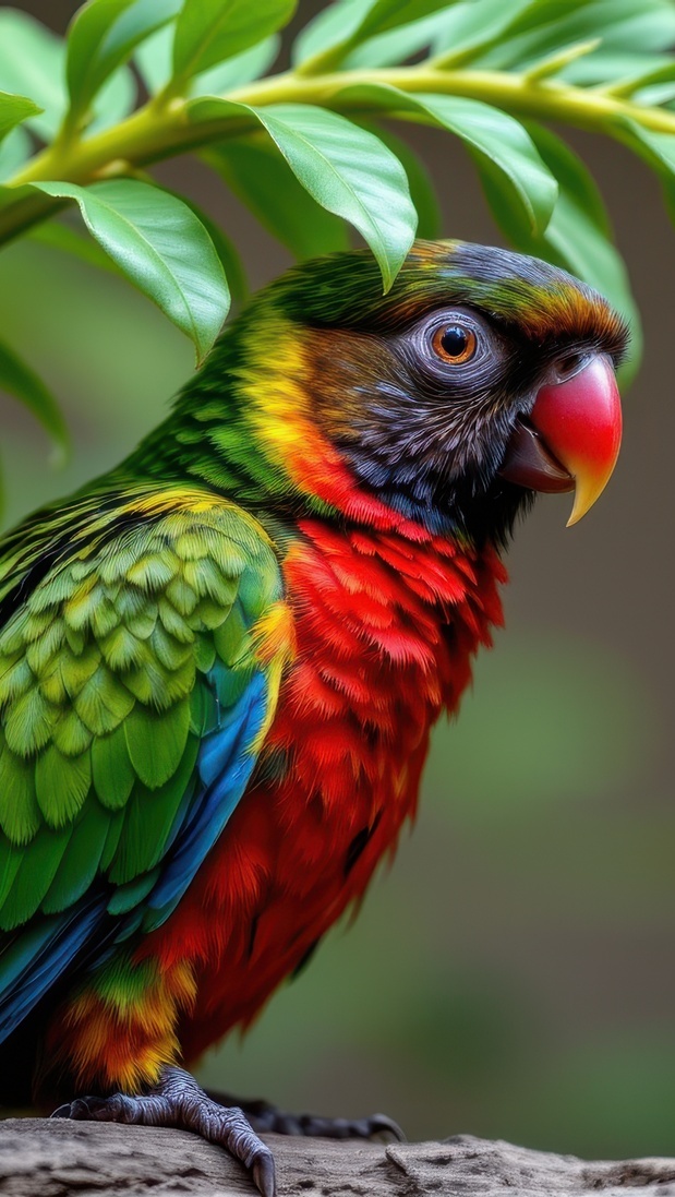 Edytor tapety: Kolorowa papuga pod zielonym liściem