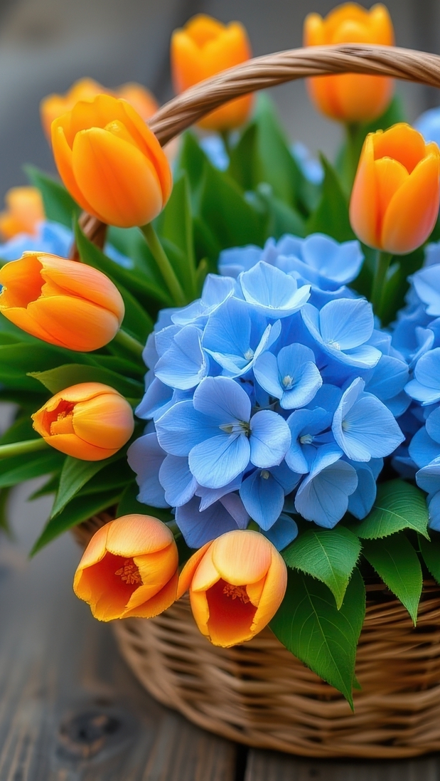 Edytor tapety: Tulipany i niebieska hortensja w koszyku