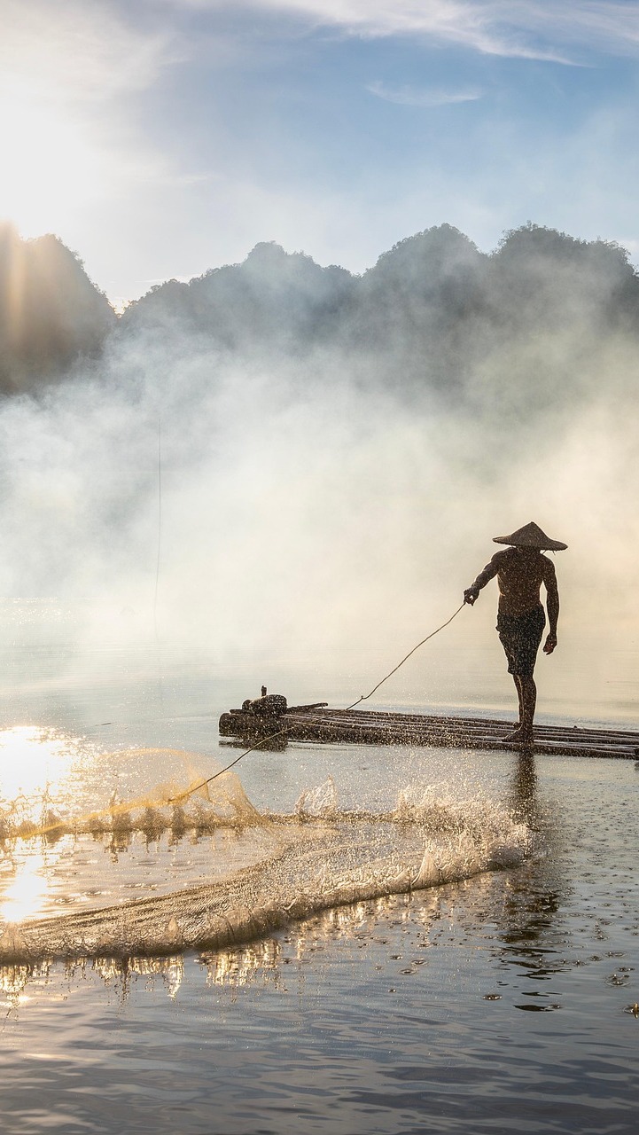 Edytor tapety: Rybak zarzucający sieci na zamglonym jeziorze