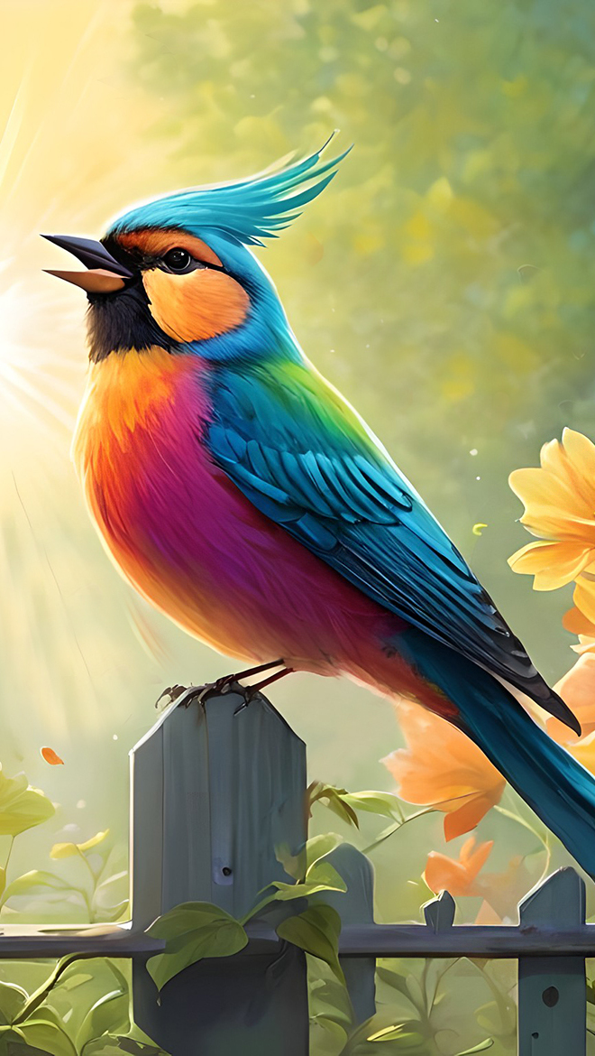 Edytor tapety: Kolorowy ptak na płocie w grafice