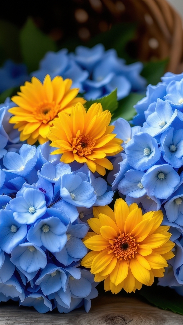 Edytor tapety: Trzy żółte kwiaty wśród niebieskiej hortensji