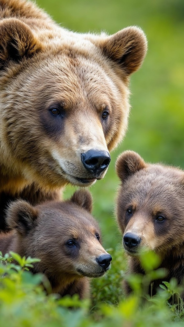 Edytor tapety: Niedźwiedzica i dwa niedźwiadki na trawie