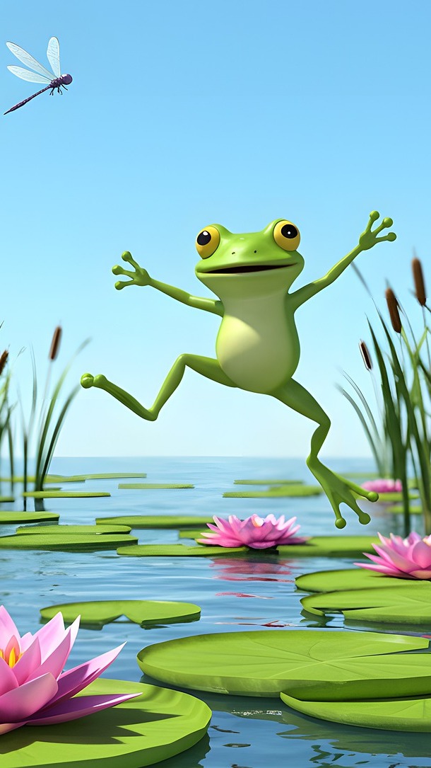 Edytor tapety: Wesoła żaba skacząca po liliach wodnych