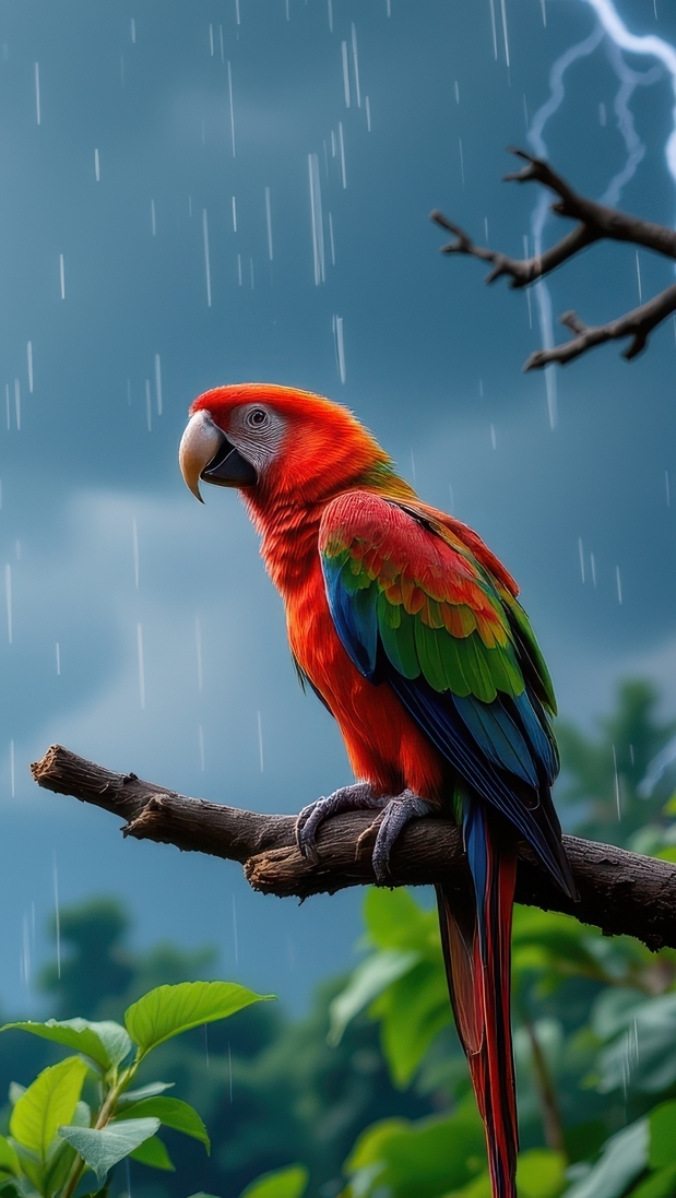 Edytor tapety: Ara na gałązce w padającym deszczu