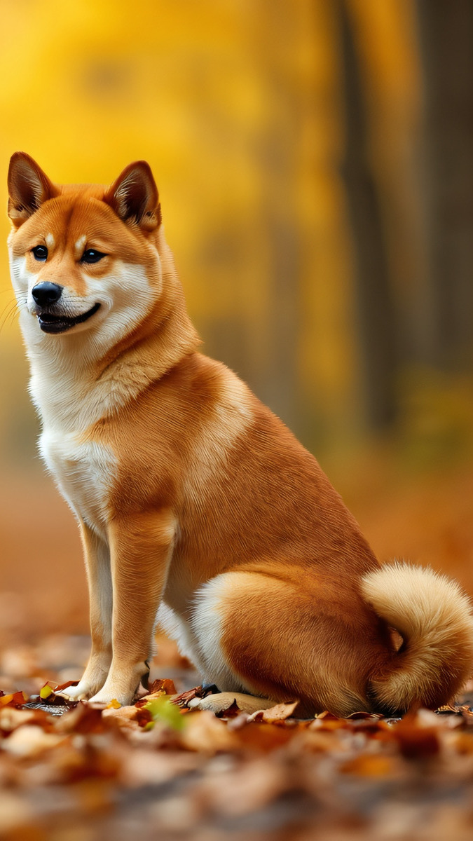 Edytor tapety: Shiba inu siedzący na jesiennych liściach