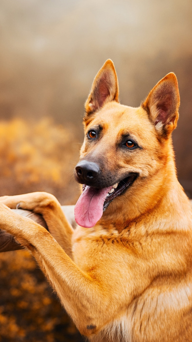 Edytor tapety: Owczarek niemiecki oparty łapkami o ogrodzenie