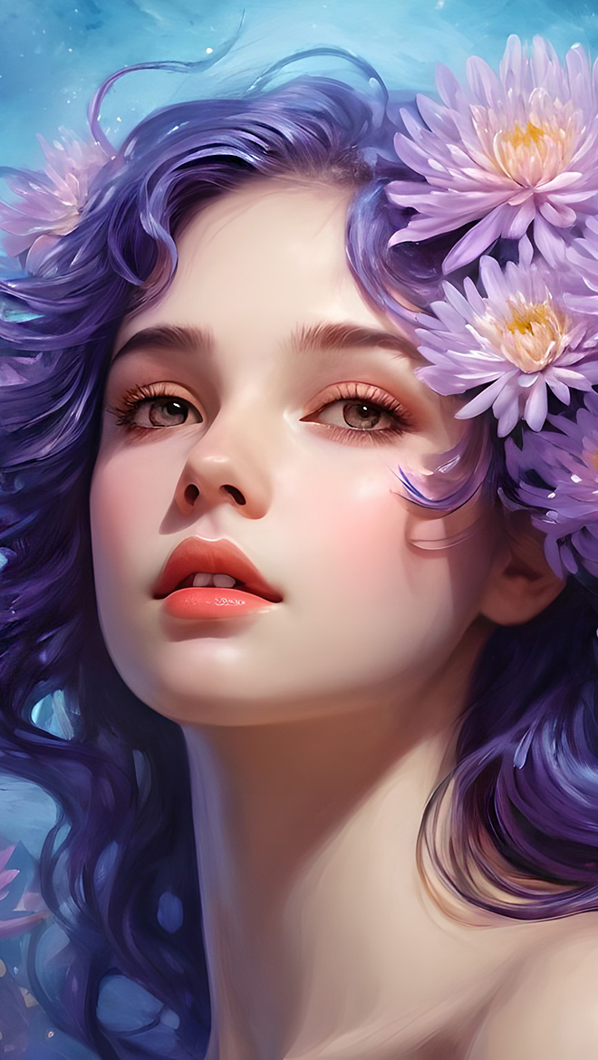 Edytor tapety: Twarz dziewczyny obok jasnofioletowych astrów