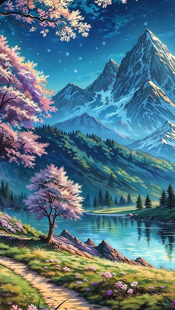 Edytor tapety: Kwitnące drzewa nad górską rzeką
