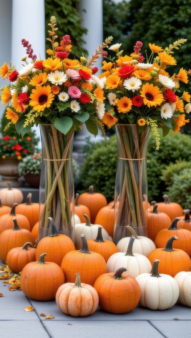 Edytor tapety: Dynie obok dwóch wazonów z kwiatami