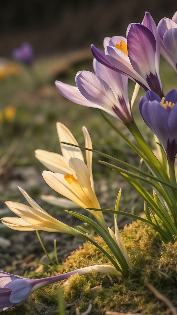 Edytor tapety: Kępki kolorowych krokusów w słonecznym świetle