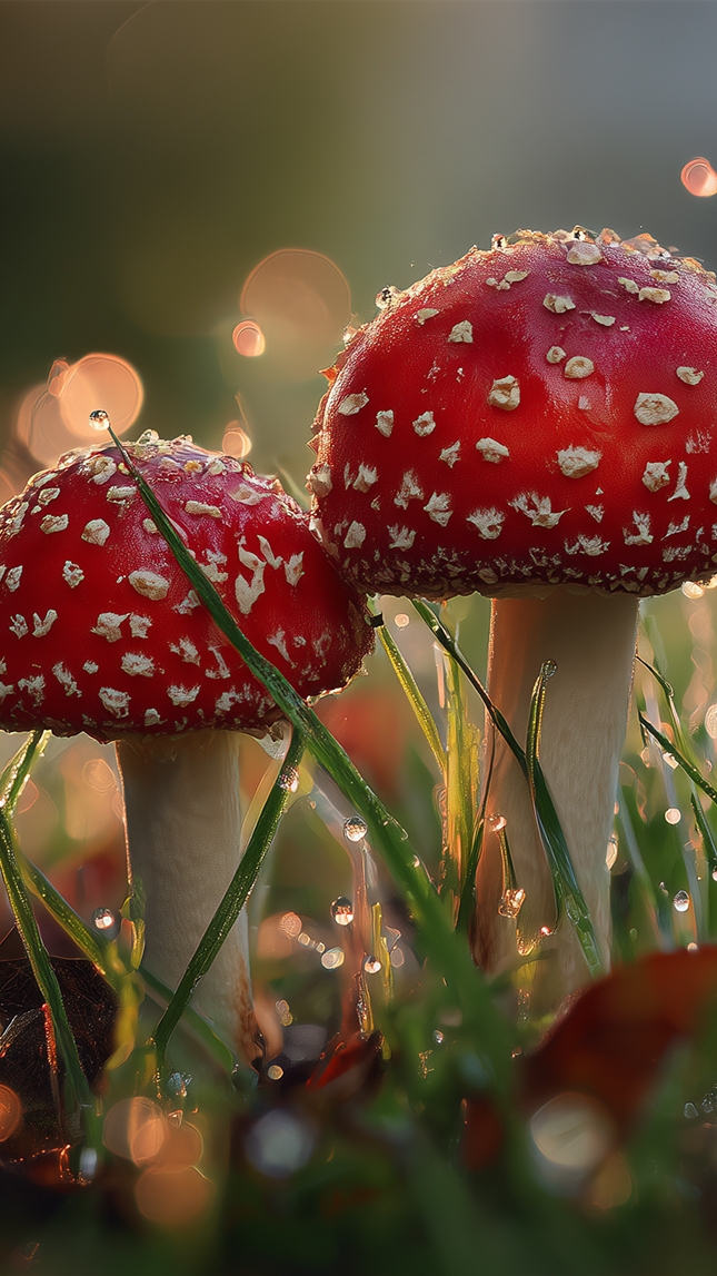 Edytor tapety: Dwa czerwone muchomory w mokrej trawie