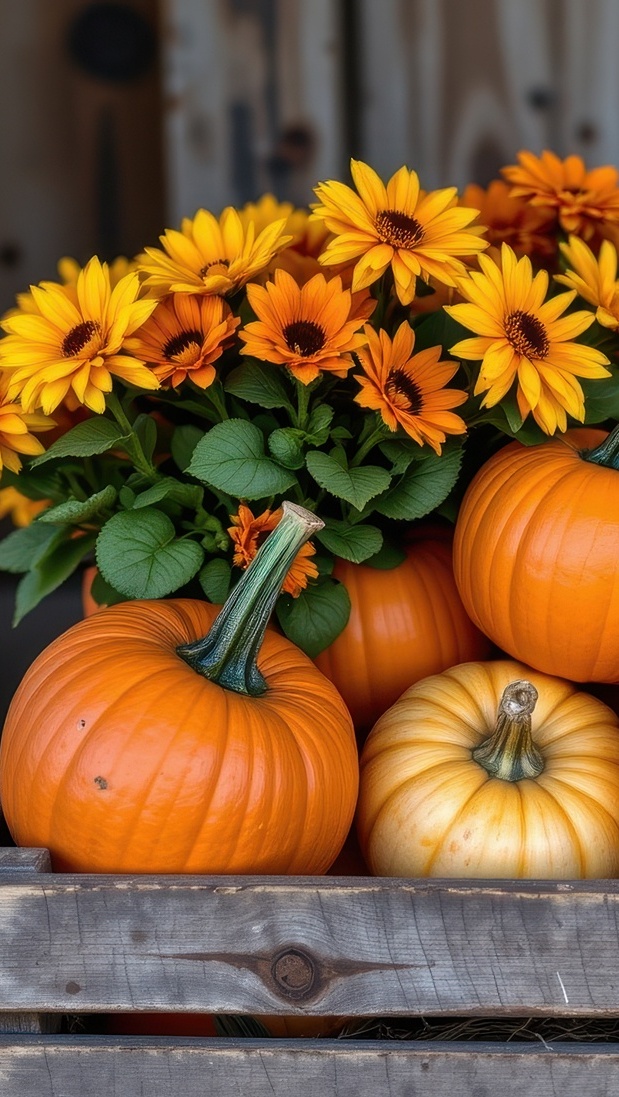 Edytor tapety: Dynie i pomarańczowe kwiaty w skrzynce