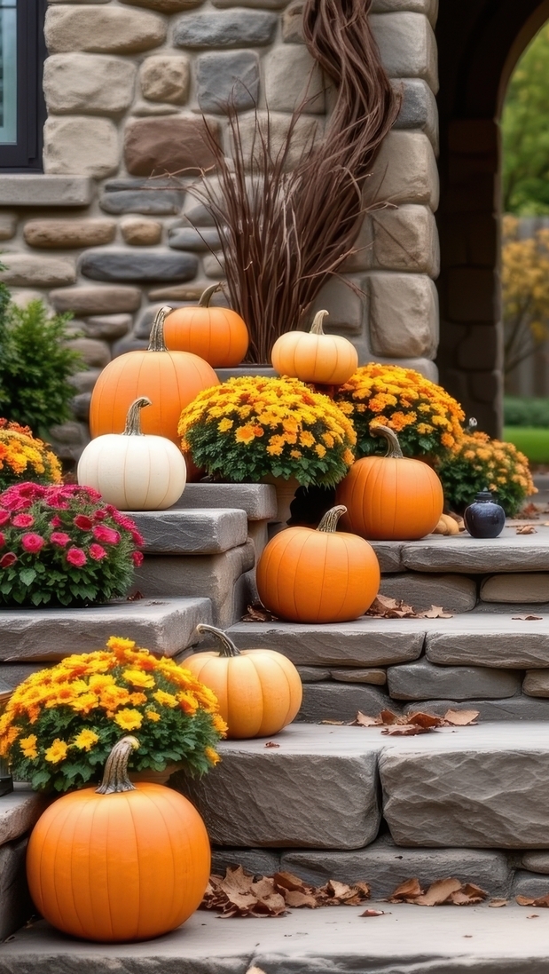 Edytor tapety: Chryzantemy i dynie na kamiennych schodach