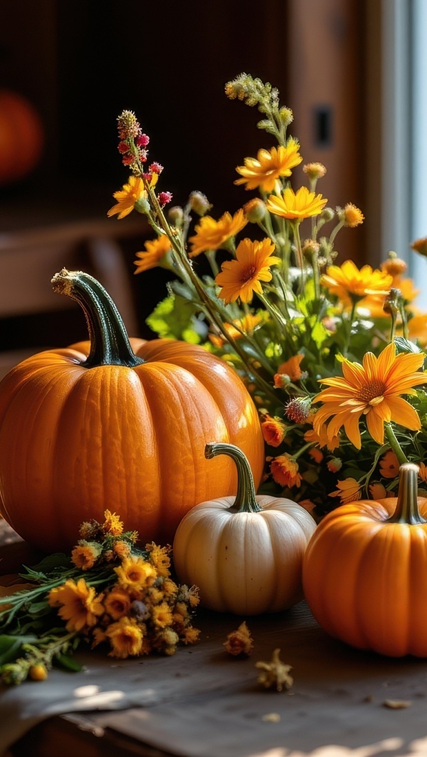 Edytor tapety: Dynie i żółte kwiaty na stole